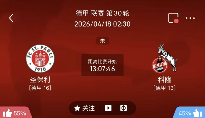 周五007德甲联赛:圣保利VS科隆 比赛时间:2026-04-18 02:30