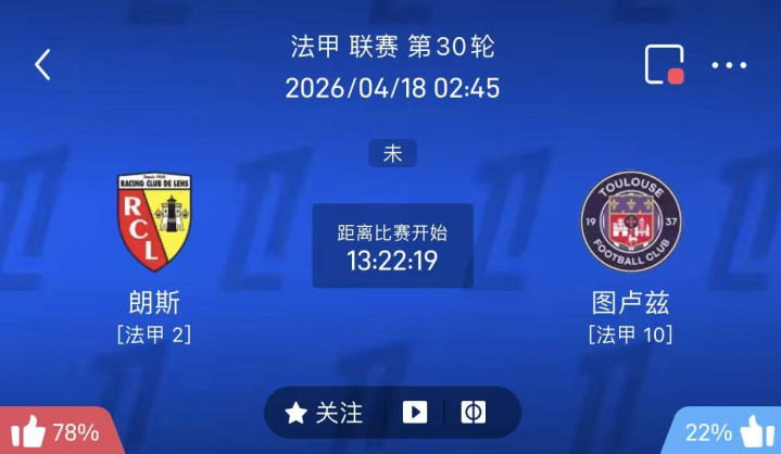 周五009法甲联赛:朗斯VS图卢兹 比赛时间2026-04-18 02:45